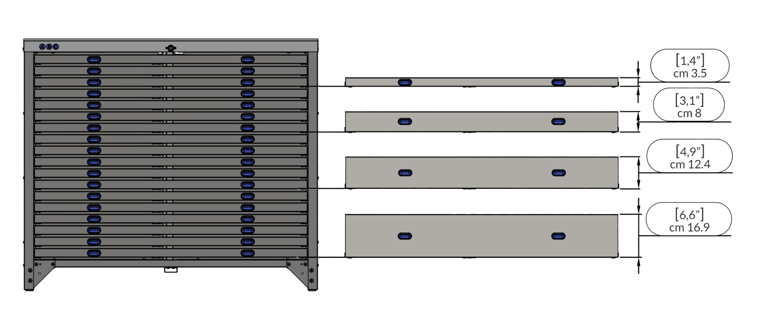 The available range of horizontal cabinet has drawers with a height of 35 mm, which allows all types of dies to be stored without superpose.